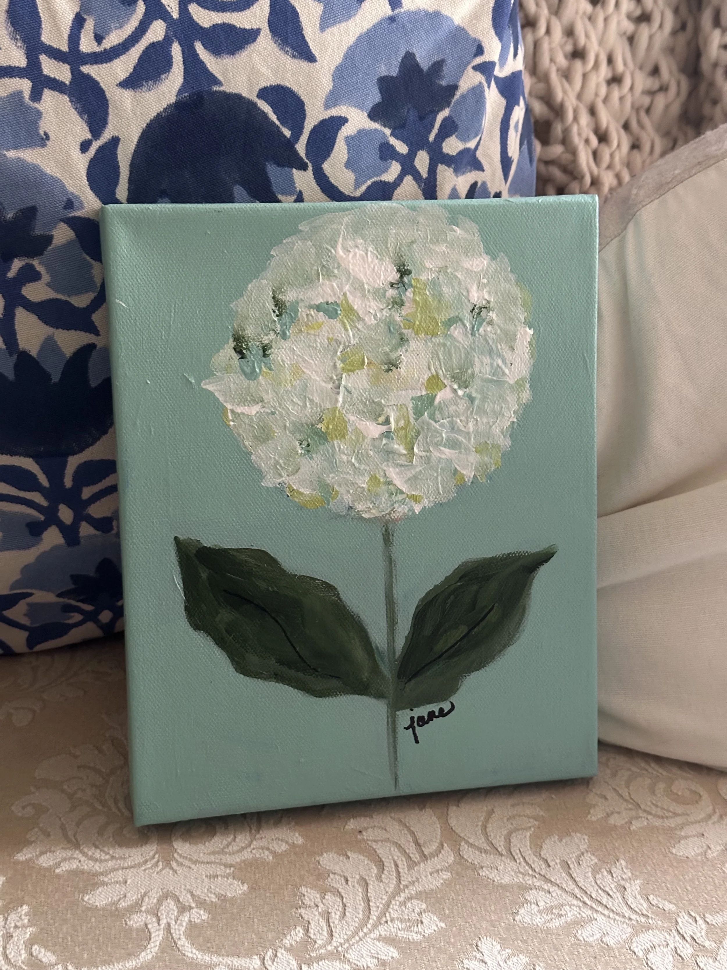 These original acrylic paintings on canvas capture the timeless beauty of hydrangeas in a soothing palette of soft greens and serene blues. Each piece is delicately layered with textured brushstrokes that echo the natural grace and fullness of hydrangea blooms, offering a gentle, calming presence. Inspired by peaceful rhythm of nature, the artwork invites the viewer into a space of reflection and tranquility.