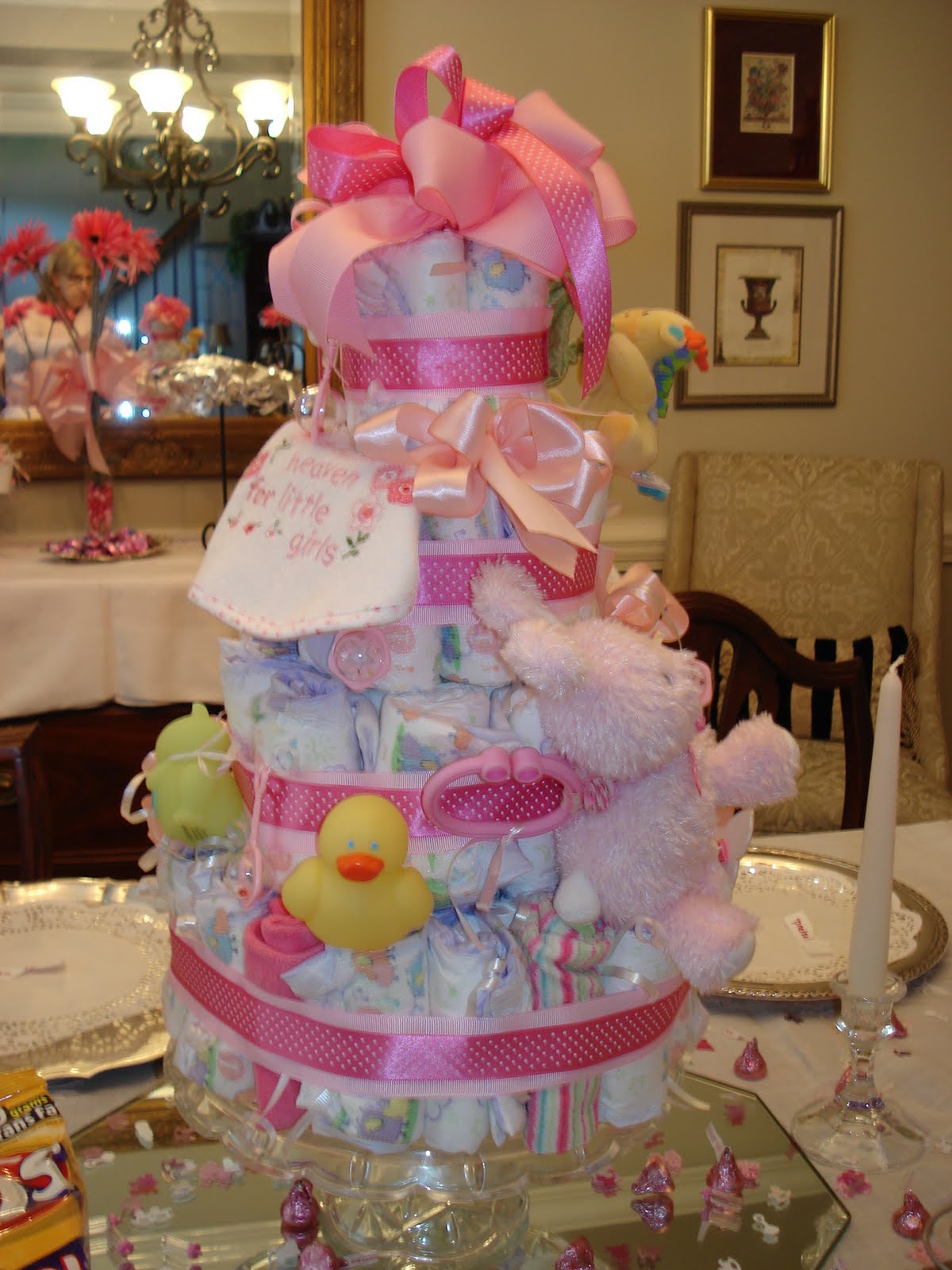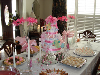 Lots of pink around and I was thrilled to have the opportunity to make a diaper cake and find the perfect favors to give out to the guest as they were leaving. My thought is that you can`t have a party or gathering without a little something to give as the guests leave. It doesn`t have to be a big gift, just a little something to take away with them to remember the party.I found these cute little white buckets at the Dollar store, 3 for $1.00, and got bunches of them. Used a Deco Pen from Michaels to write the baby`s name on them and filled them up with pink M&M`s. The pink flowers went in a clear vase, filled with the same pink M&M`s. We made the guest of honor a coursage out of baby socks and pinned it on as soon as she arrived.Great memories for this special little girl`s baby shower.